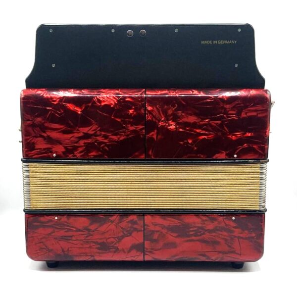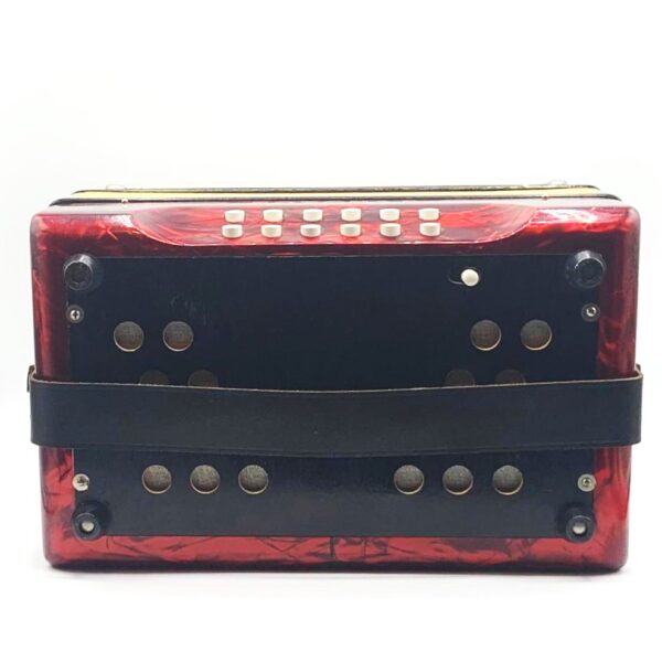 Hohner Corona II melodeon, keys of A/D/G. A vintage instrument made in Germany with red celluloid casework. This box is in excellent condition, and has recently undergone minimal restoration, with new bellows gasket, grille cloths and bellows pins.